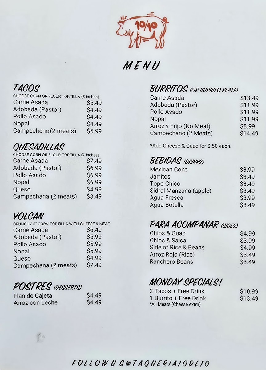 Located in the heart of Austin, Taqueria De Diez (D/10) offers a vibrant menu brimming with authentic Mexican flavors. Their burritos are a hearty delight, featuring grilled options such as Pollo Asado and Carne Asada, all wrapped in 12" flour tortillas, with toppings available for an extra indulgence. The standout Volcan tacos, served on crispy corn tostadas, introduce a delightful crunch, with selections like Nopales Asados welcoming adventurous eaters to try grilled cactus.